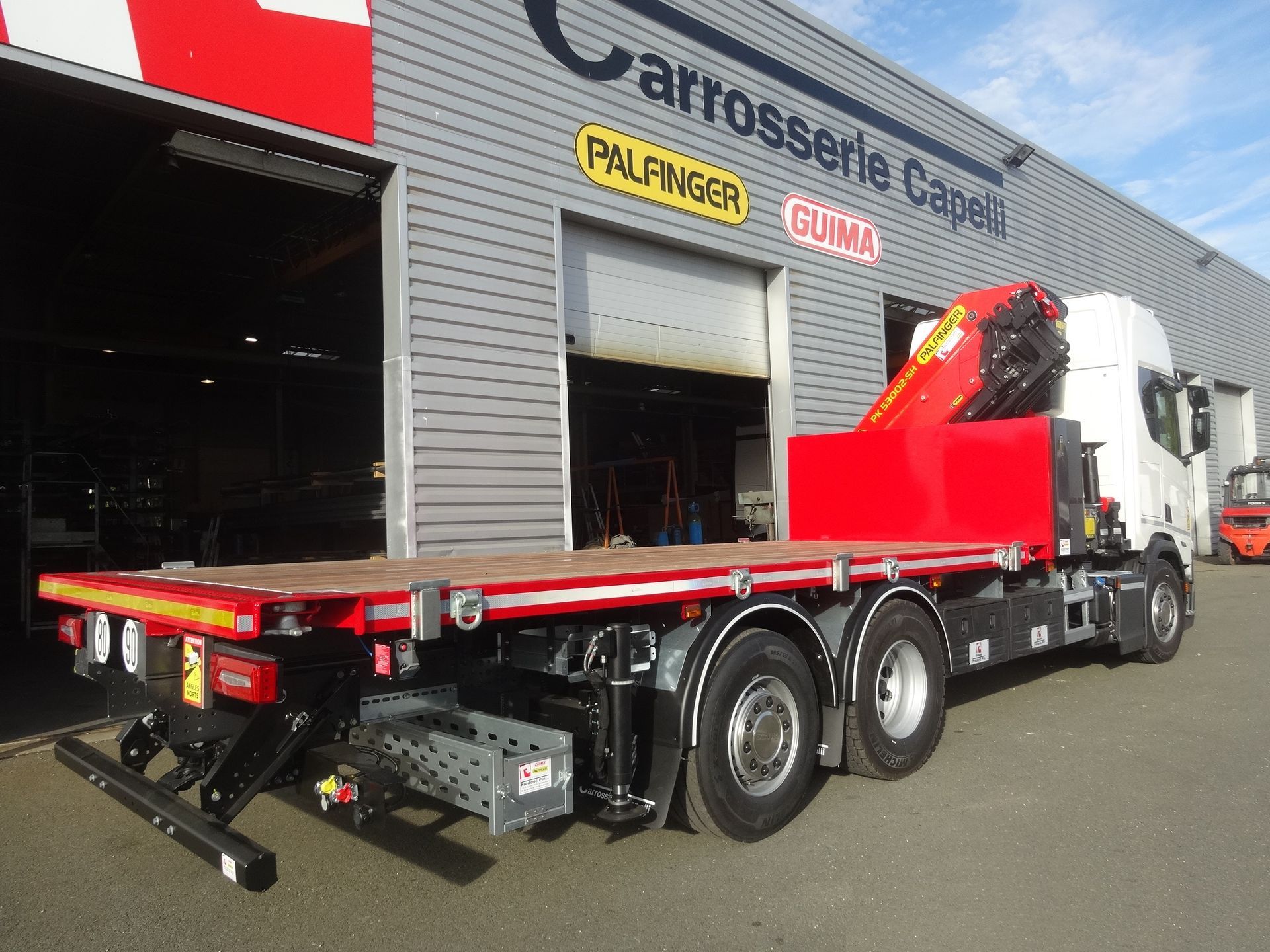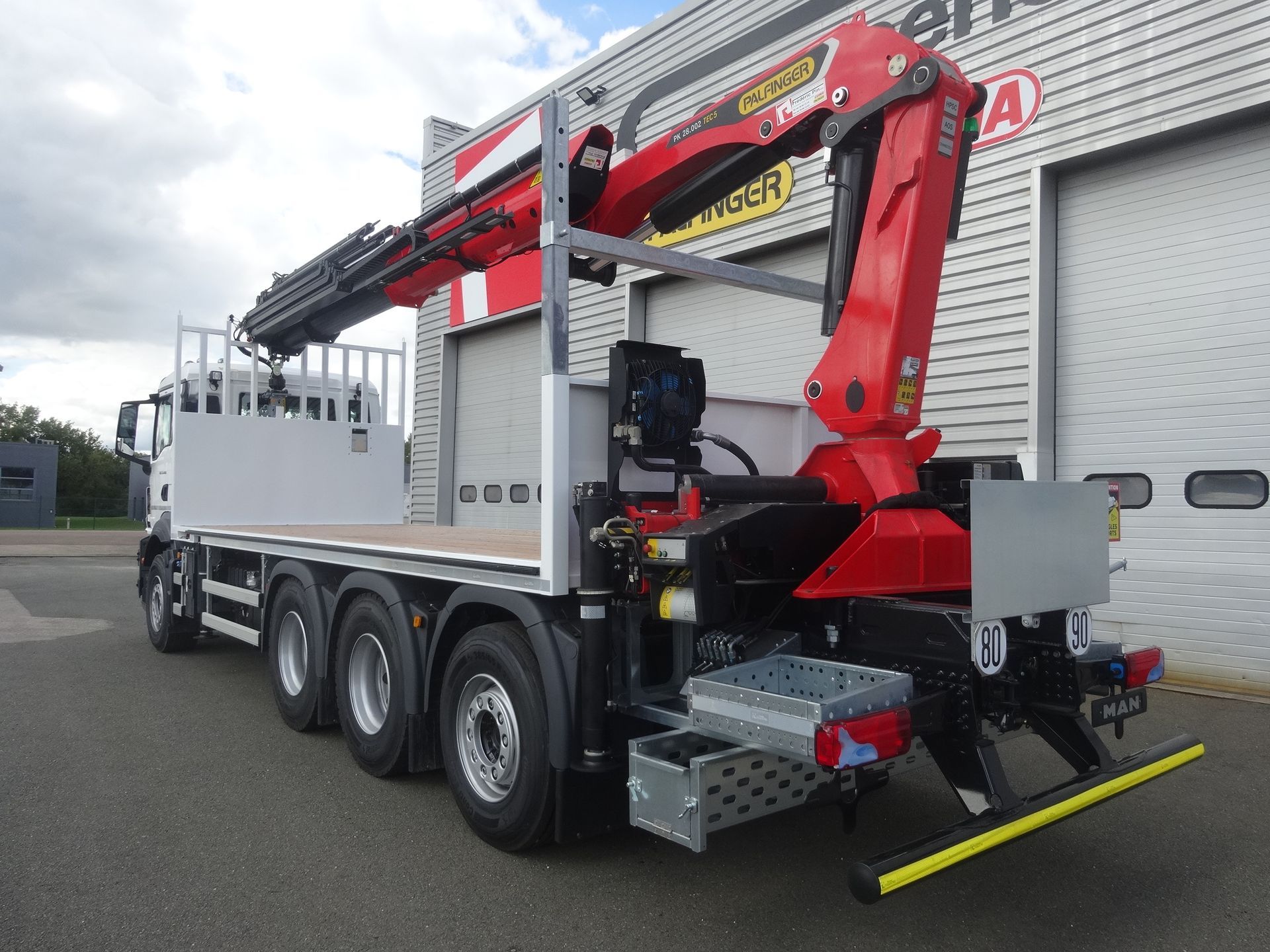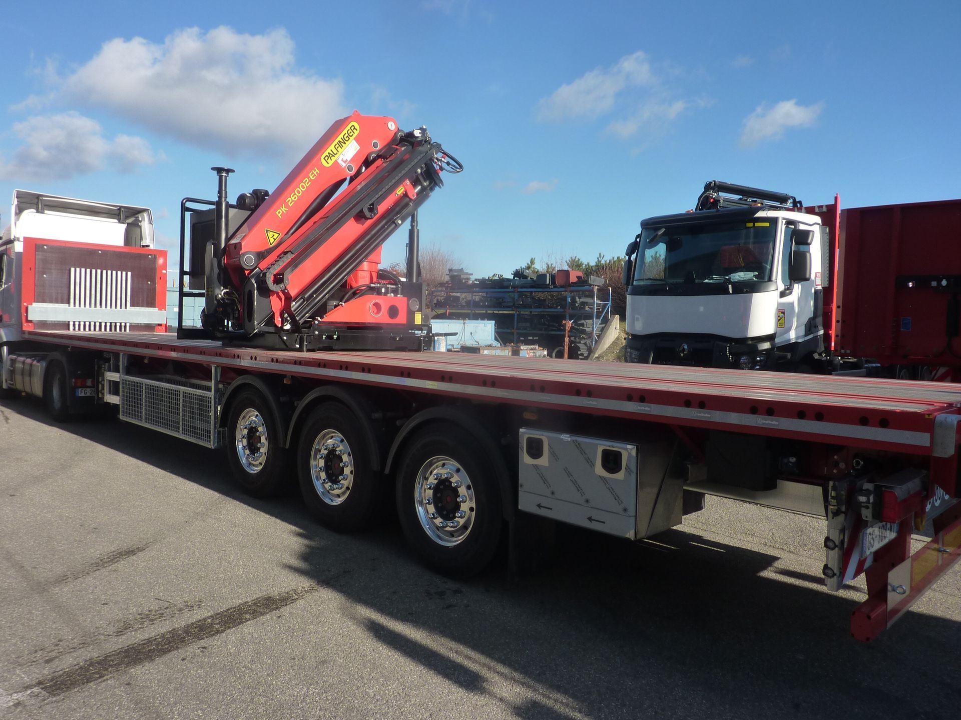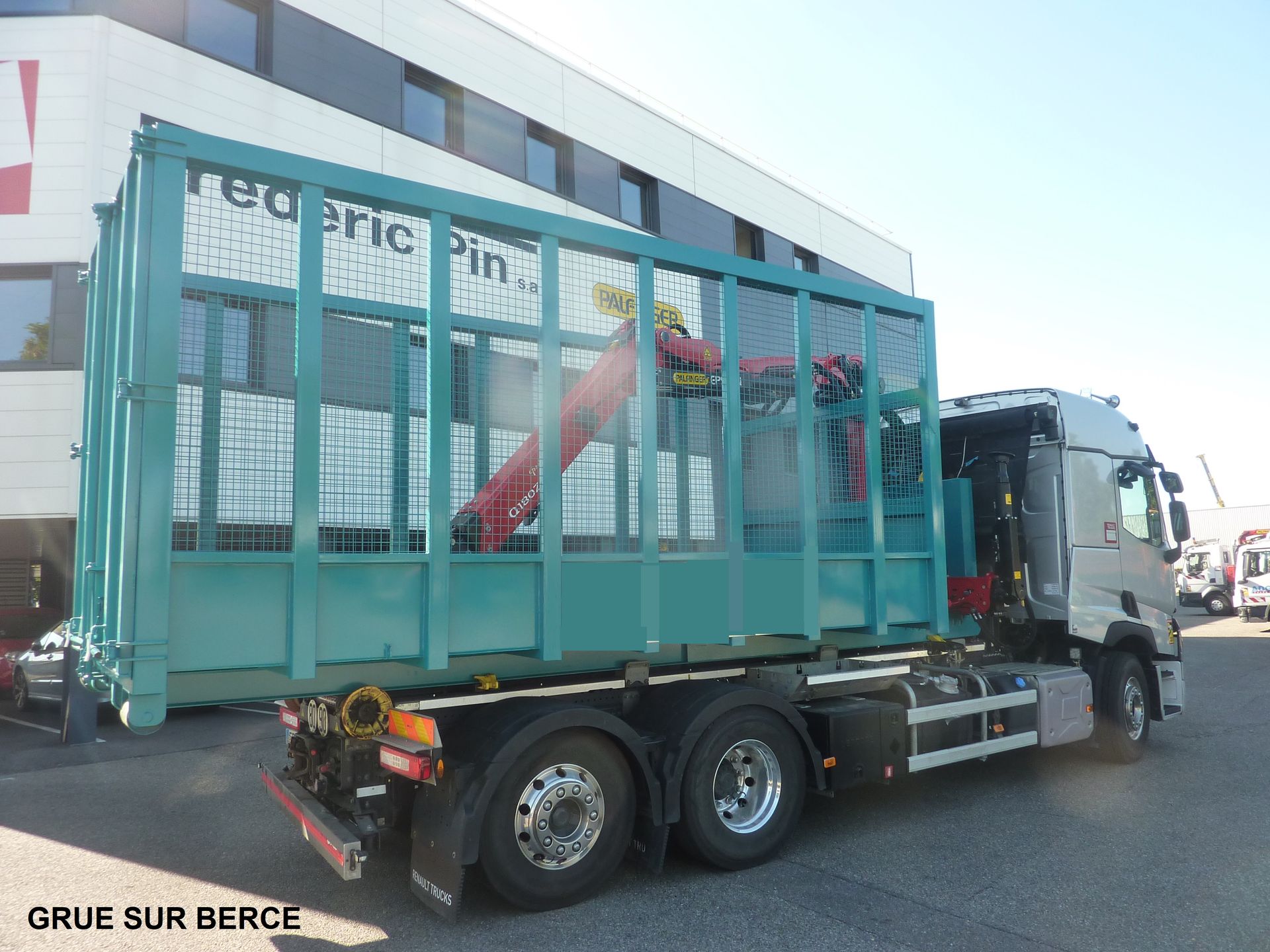 - Avec un plateau, fixée dos cabine ou en porte à faux arrière pour tous les métiers de charpentiers, transport de matériaux…