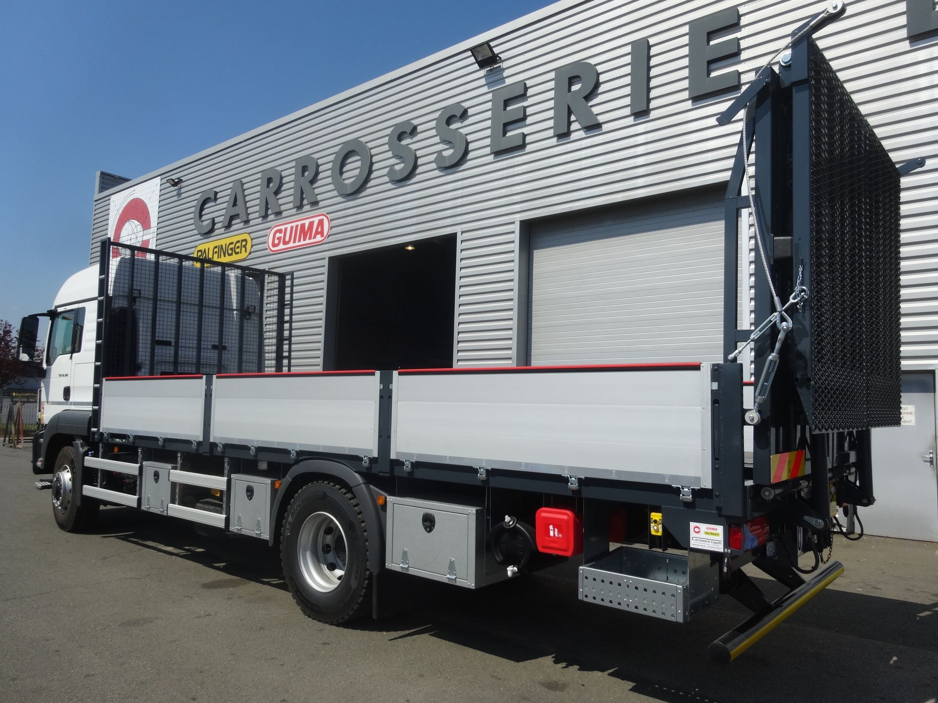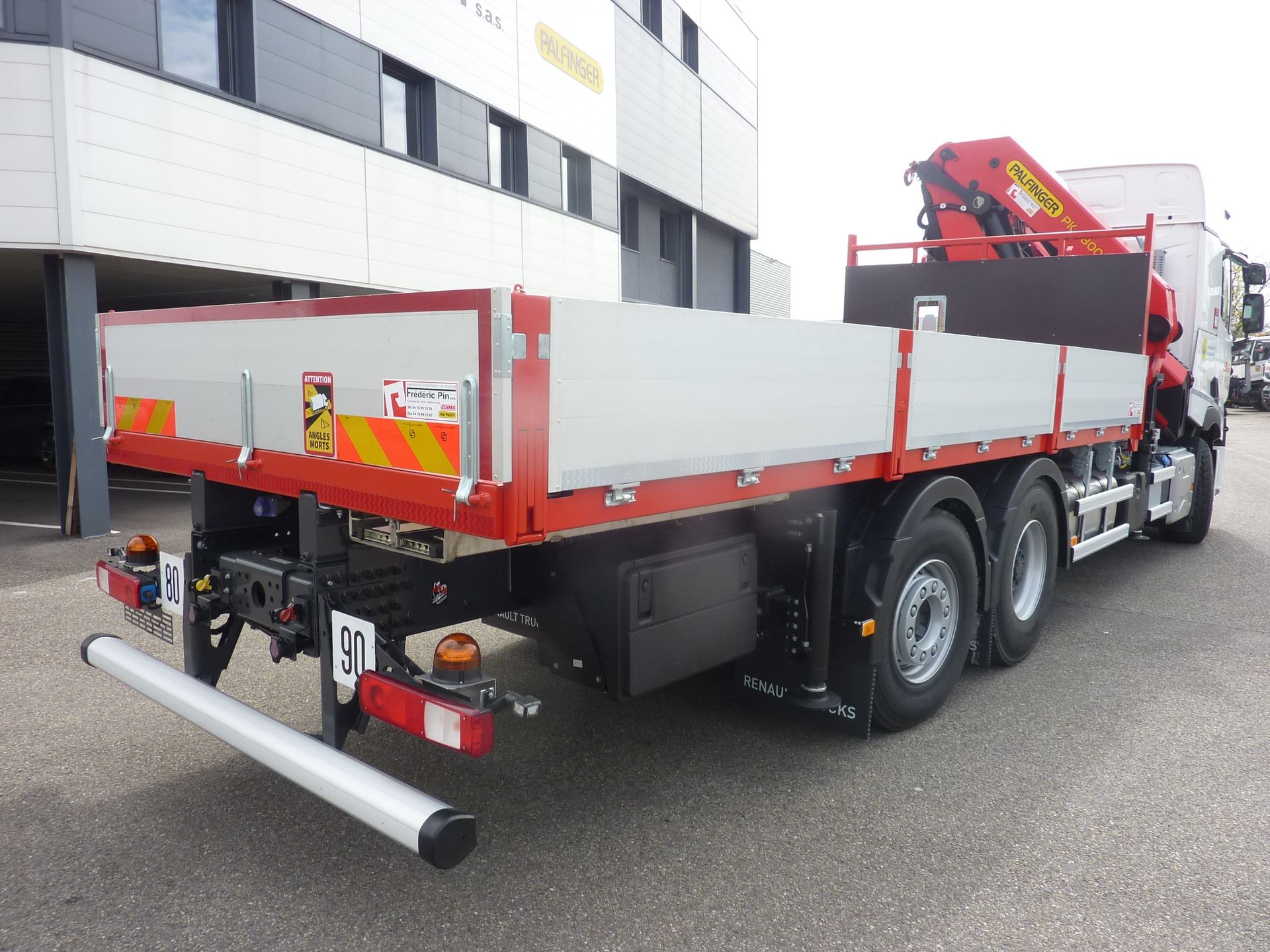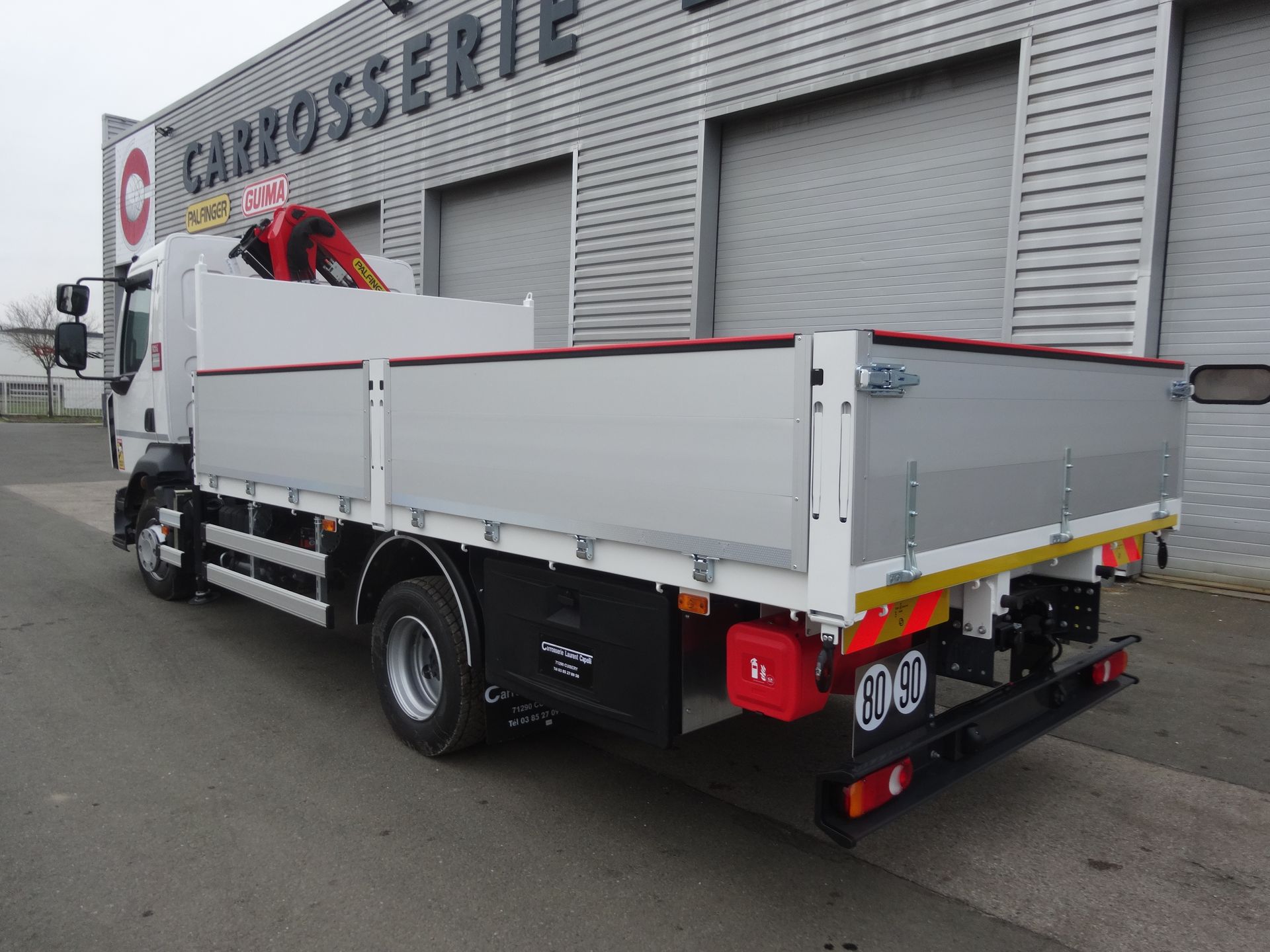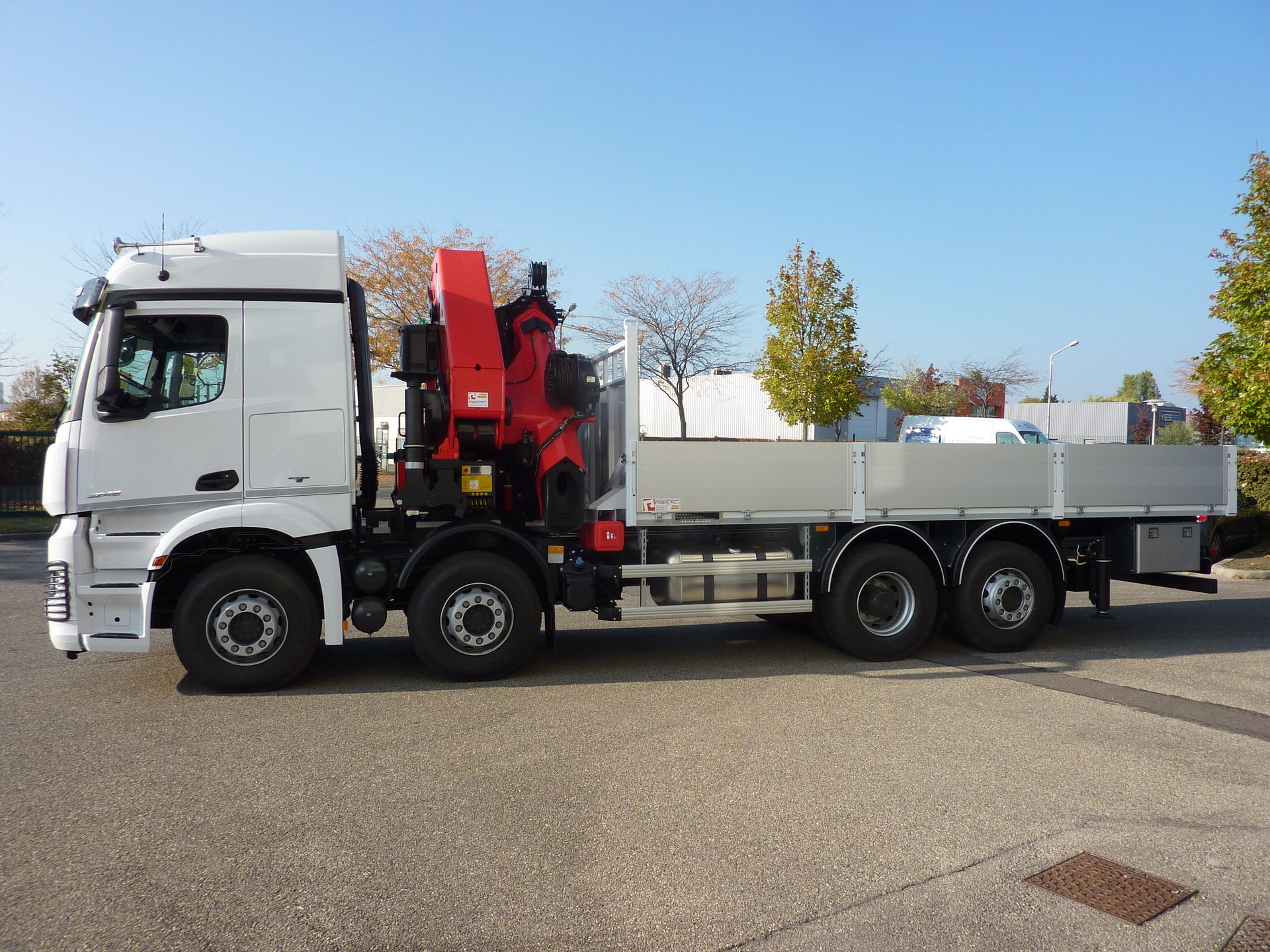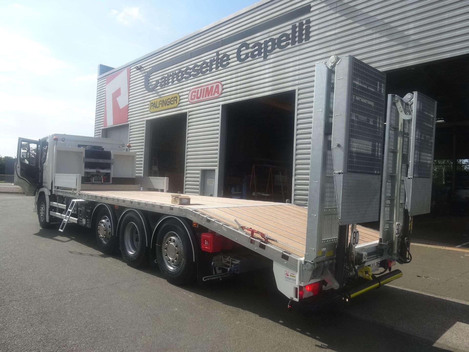 - Avec un plateau, fixée dos cabine ou en porte à faux arrière pour tous les métiers de charpentiers, transport de matériaux…